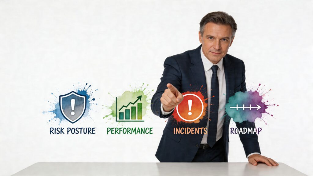 | Third-party risk | Status of high-risk vendors and any unresolved decision points | Proves oversight beyond your own walls |