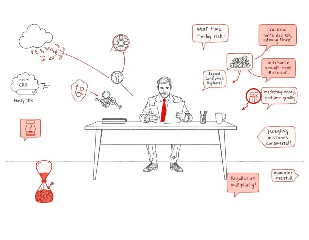 Minimalist grayscale sketch illustration of a confident executive controlling third-party risk management with a one-page vendor map highlighting high-risk vendors in red, surrounded by sprint steps and subtle CTO advisor support.
